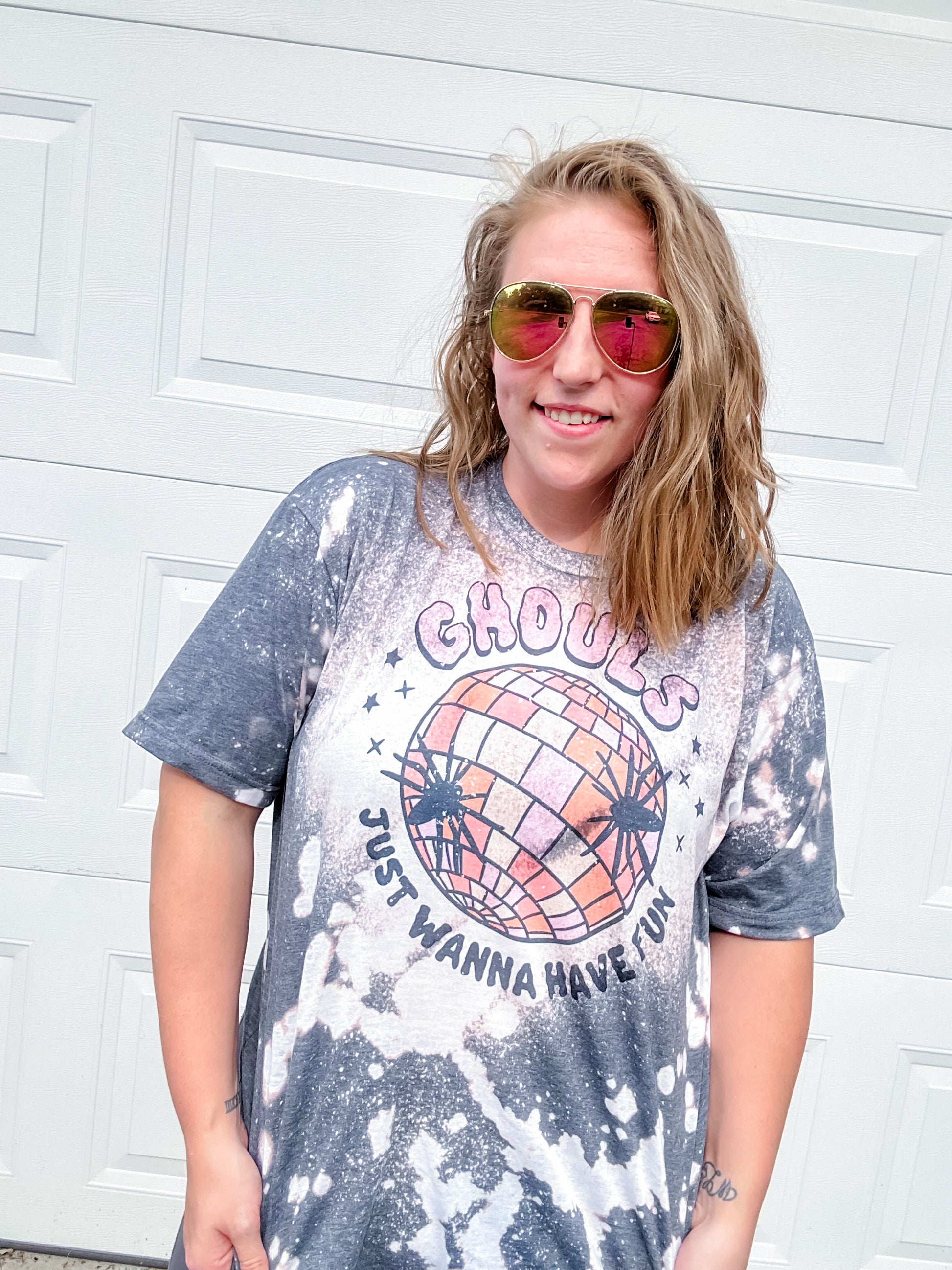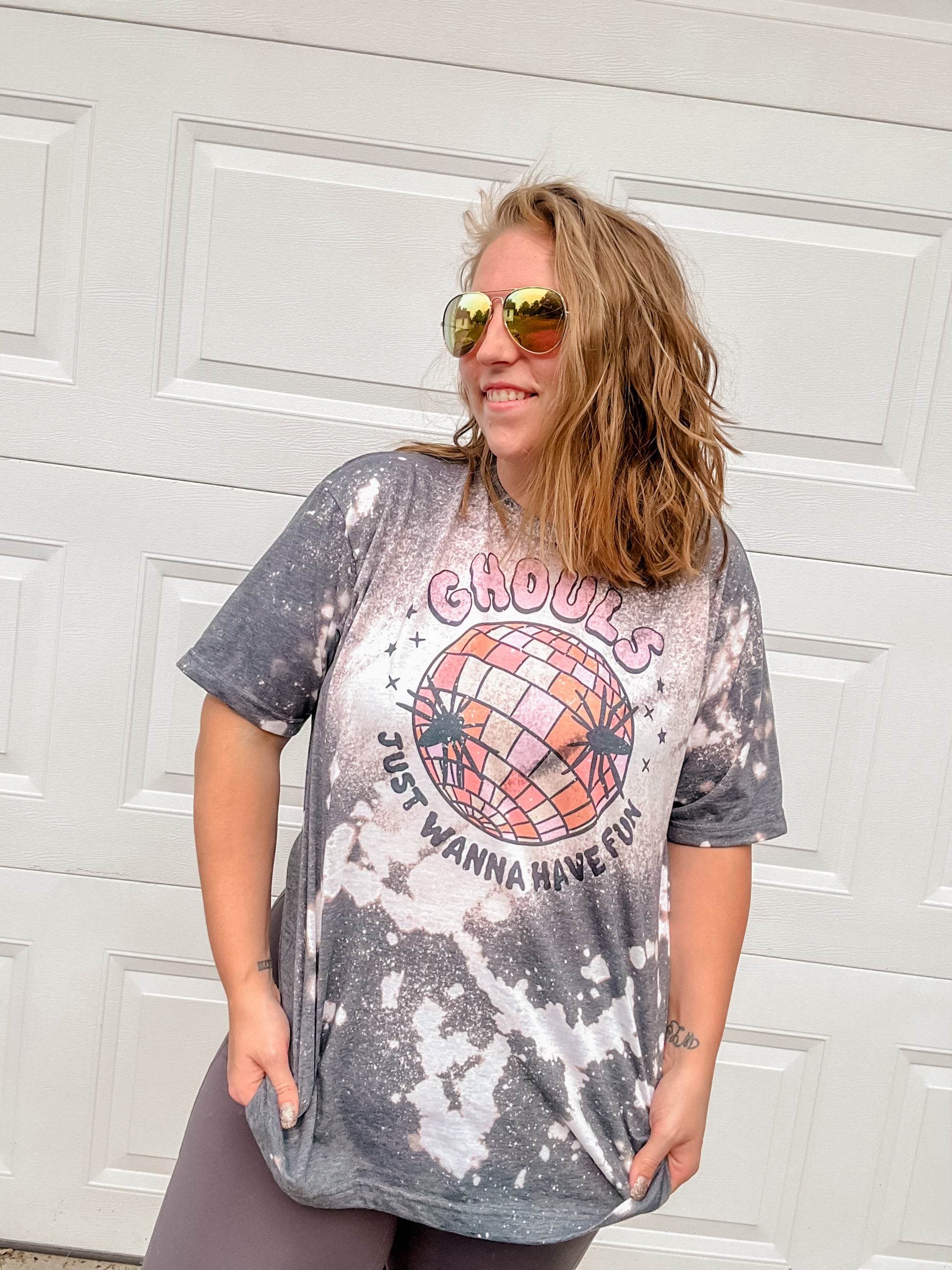 - Due to dyed and bleached items being hand dyed/bleached, it is impossible for every single shirt to be the same. We maintain the same steps each time to ensure as close as we can. Due to dyes used, there may be random specs of color. That is NOT something we can prevent. We can NOT prevent minor imperfections, color figments and color variations.